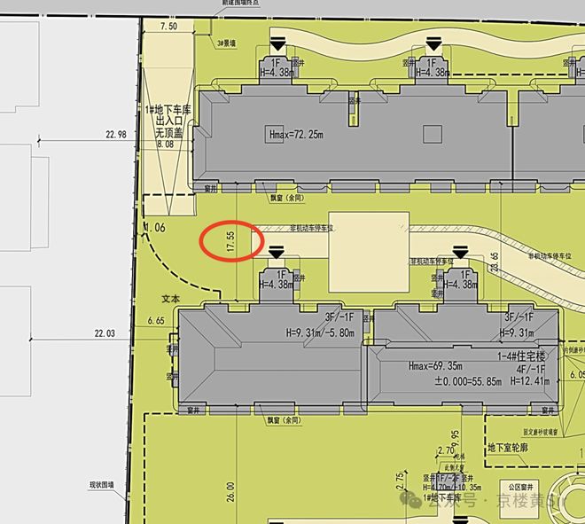 :规划图显示项目分东西两区行列式排布,官方公示明确西区楼间距18-25米,东区最大达37.55米。需重点关注西区3#、4#、5#等北侧退台楼栋,部分楼栋实际窗间距仅18米,刚好达到多层住宅采光最低标准。低楼层(1-2层)会面临明显对视问题,且冬季日照时长可能不足3小时,居住舒适度打折扣。